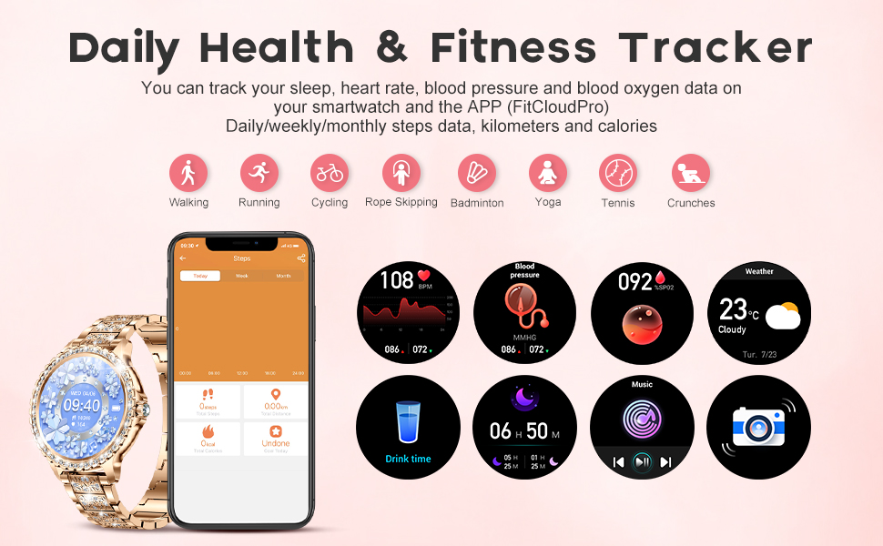 There are more than 20 sports modes tracking available in the fitness tracker, covering almost all daily sports activities, the all-day activity tracking feature monitors your steps, distance, and calories burned all the day, so you can see how much progress you've made towards your fitness goals.