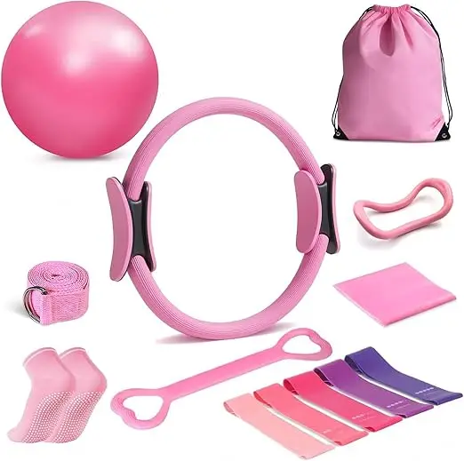 - 【Pilates essentials kit for women】The pilates workout kit includes 1 Pilates ring, 1 yoga ball, 5 colorful yoga bands, 1 resistance band, 1 fabric resistance band, 1 pair of Pilates socks with non-slip grip, 1 150 cm elastic band, 1 arm stretcher, and 1 storage bag; whether you are practicing at home or outdoors, the pilates equipment for home workouts is the ideal companion
