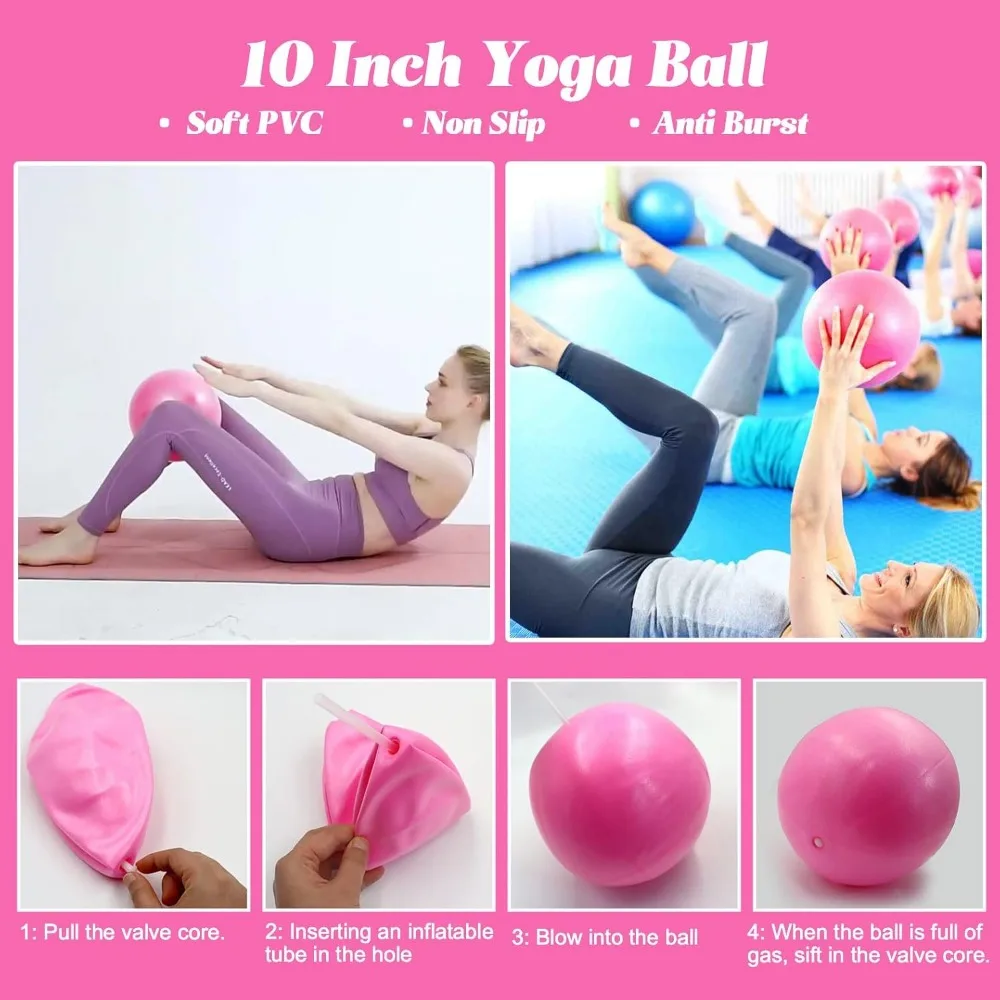 - 【Pilates Mini Balls & Resistance Bands】The Mini Pilates Ball has become a global studio essential. Crafted with non-slip, burst resistant PVC. it is a versatile tool that enhances exercises by improving stability, balance, and muscle activation. It’s perfect for adding intensity and targeting smaller muscle groups. these highly durable natural rubber bands featuring 5 resistance levels are the perfect addition to Pilates workout.